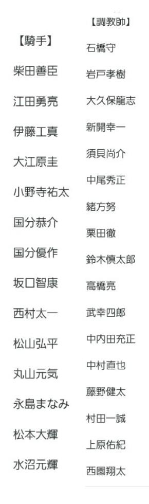 永島まなみ騎手を含めて午年騎手5名と午年調教師1名と半数が午年。