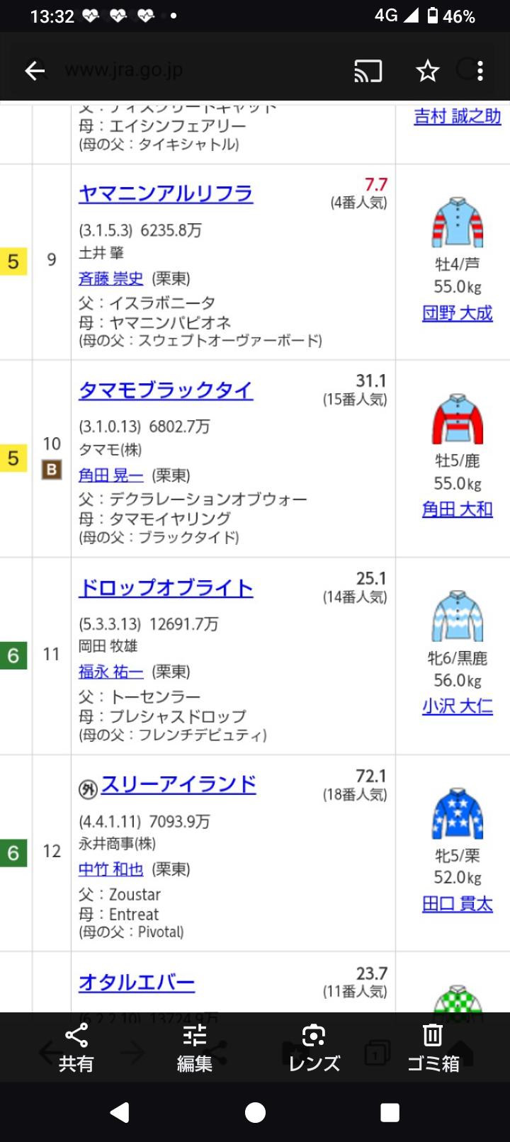 シリウス三浦の隣にショウナン。最終的にホープフルの5枠のシリウスコルト〜⑬レガレイラで。
