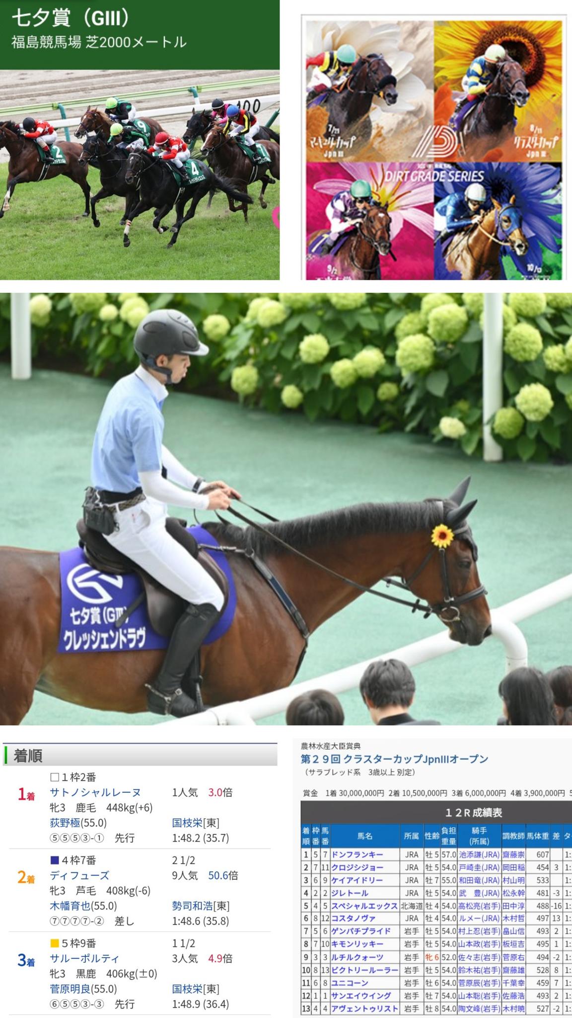 クレッシェンドラヴの耳に付けられた「ひまわり」から昨年の「クラスターC」の結果、昨年の七夕賞の画像などから目立っているのは「⑦⑨②」…健児の制?
