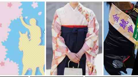 引っ張られている「昨年のプログノーシスの画像と昨年の愛子様の卒業式」。【卒業】【紅白】【振袖】。