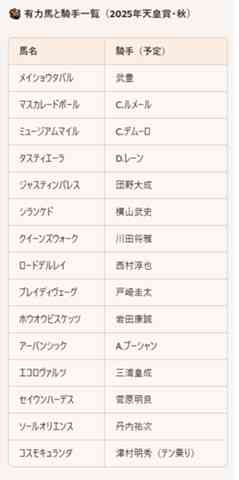 そこで、そんな方もいらっしゃるかと思い、天皇賞騎乗予定の騎手をAIにネットから探して表にしてもらいました。