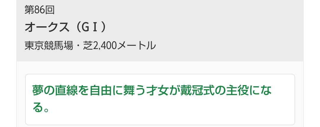 やっぱりあのポスターの「大阪杯」↔「オークス」の配置換えからオークスの方が可能性がある気がします。