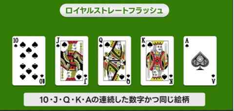 ポーカーの役 ロイヤルストレートフラッシュ 「5枚の手札がAKQJ10の並びでスーツ(マーク)もそろったもの」
