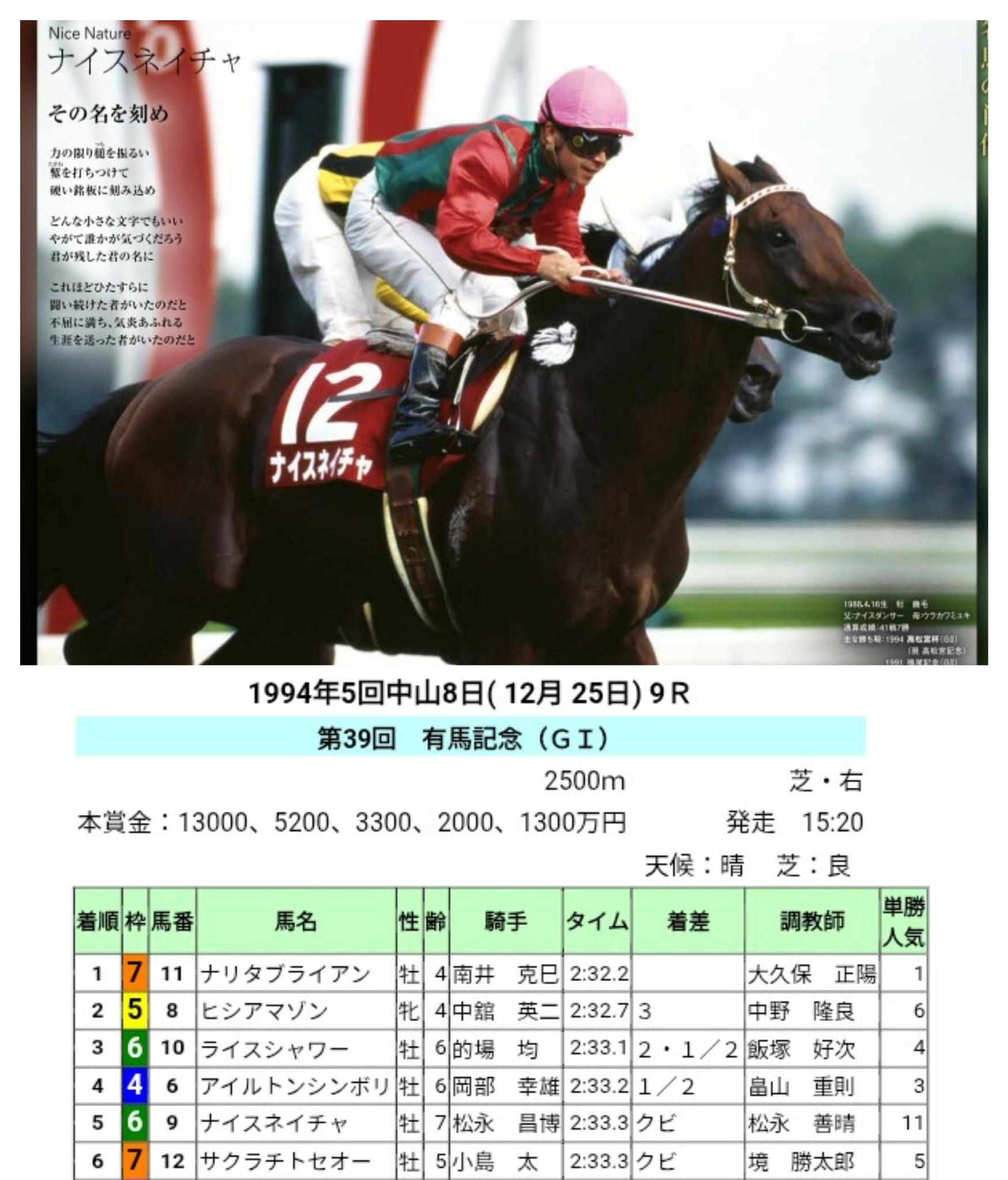 でもナイスネイチャの有馬記念連続2着が途切れたのが1994年…