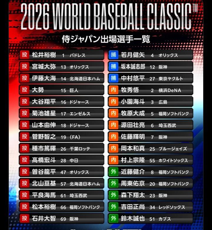 ちなみに「巨人」から「WBC」に出場するのは「大勢」一人のみ…