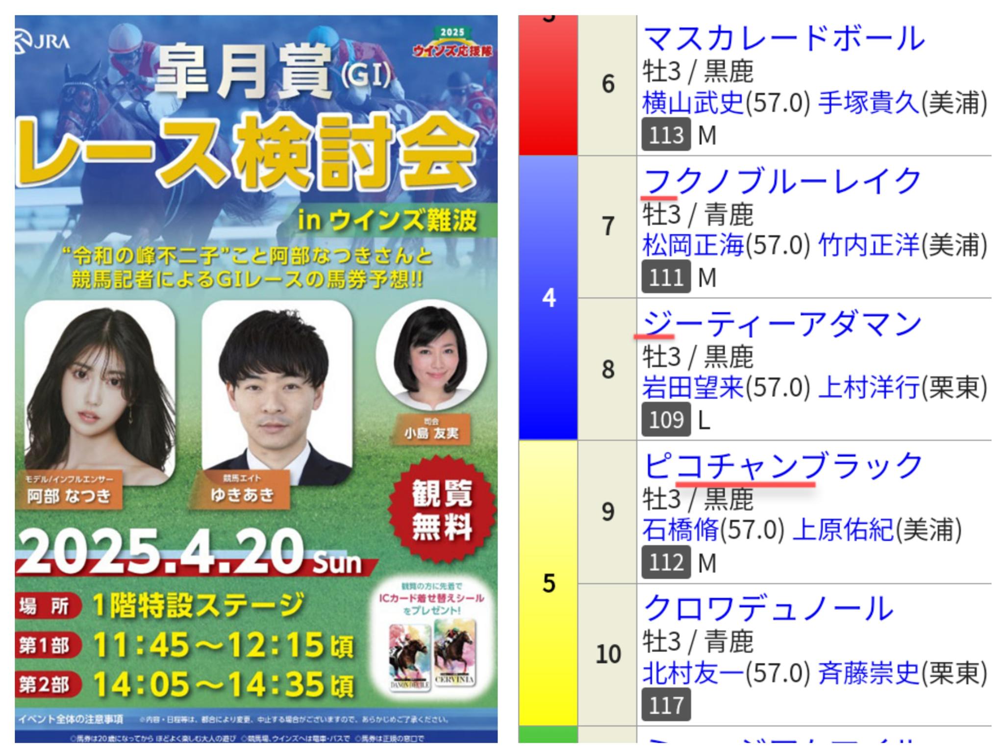 単純にスターと星のある5を枠でいこうと思います。松山は丹波と同じ都市名。ヌチバナは去年の勝ち馬。馬名にナミ(波)、馬主に、つき。皐月賞イベントからチバや野田はいい感じです。
