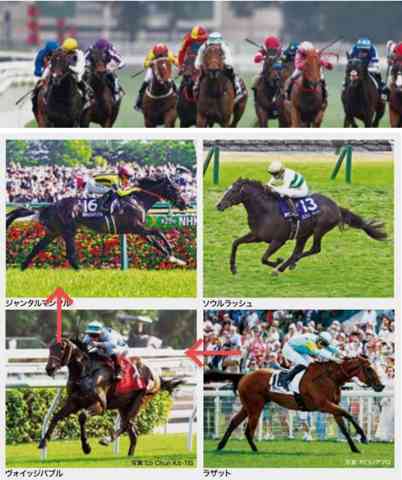 そして、ジャンタルマンタルとソウルラッシュが向かう という構図。『日本馬の足跡』には③アドマイヤマーズ。最後のページには同じ様な勝負服⑭ディヴィーナ。