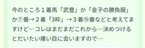 今のところ1着馬「武豊」か「金子の勝負服」か⑦番→2着「3枠」→3着⑮番などと考えてますけど…コレはまだまだこれから…決めつけるとだいたい痛い目に会いますので…