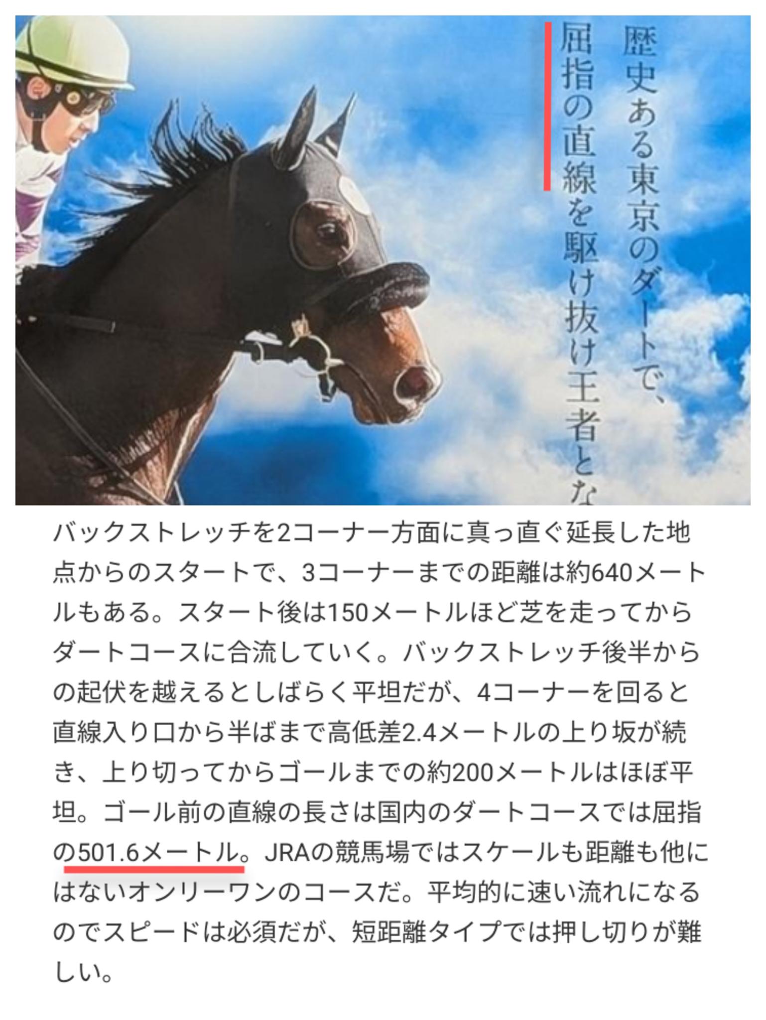 今回の「屈指の直線」というワード、気になります。ちなみに東京ダートの直線