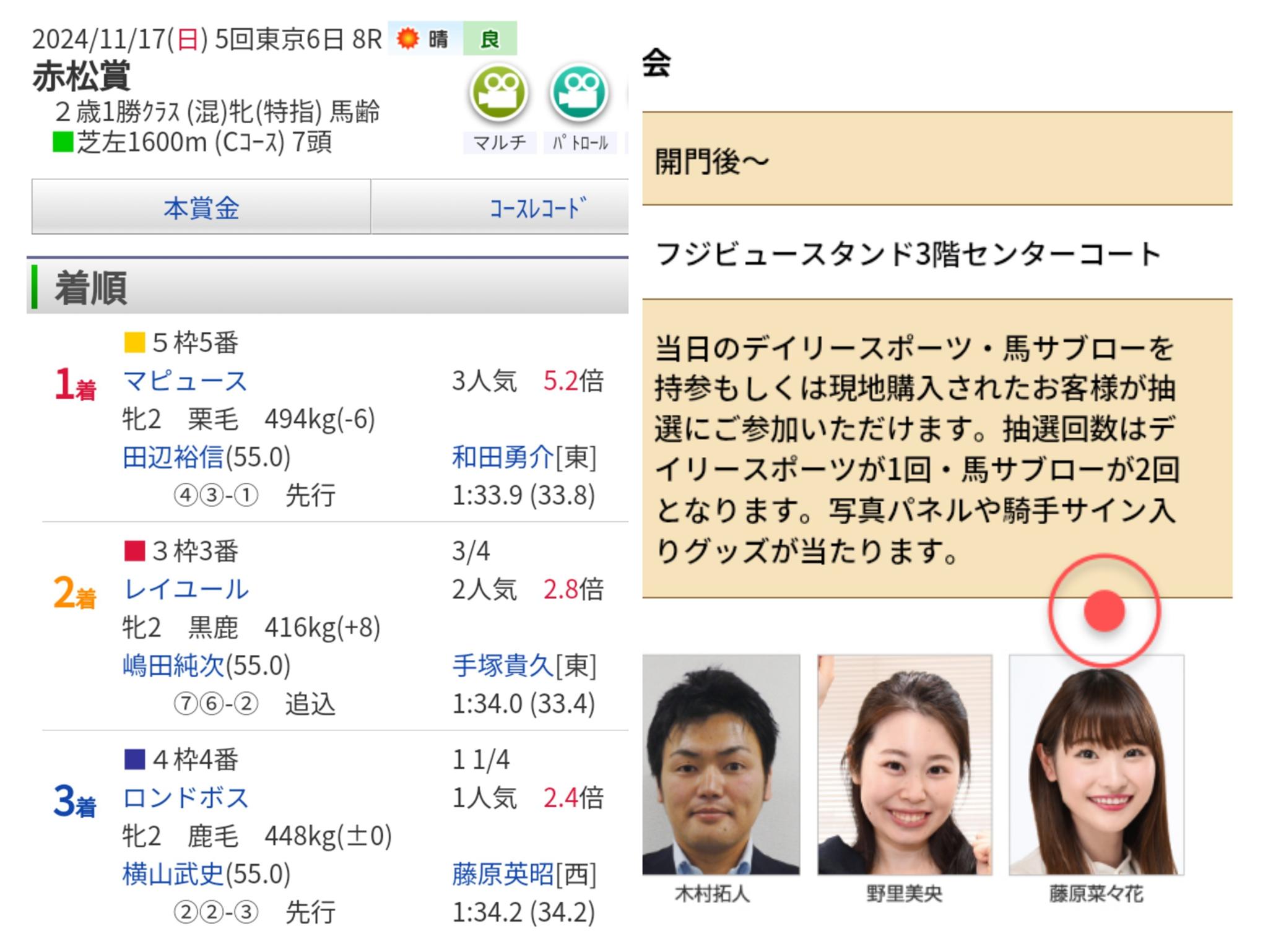 「牝馬のG1レースの実況をすること」だったハズで、藤原厩舎の馬が赤松賞3着。