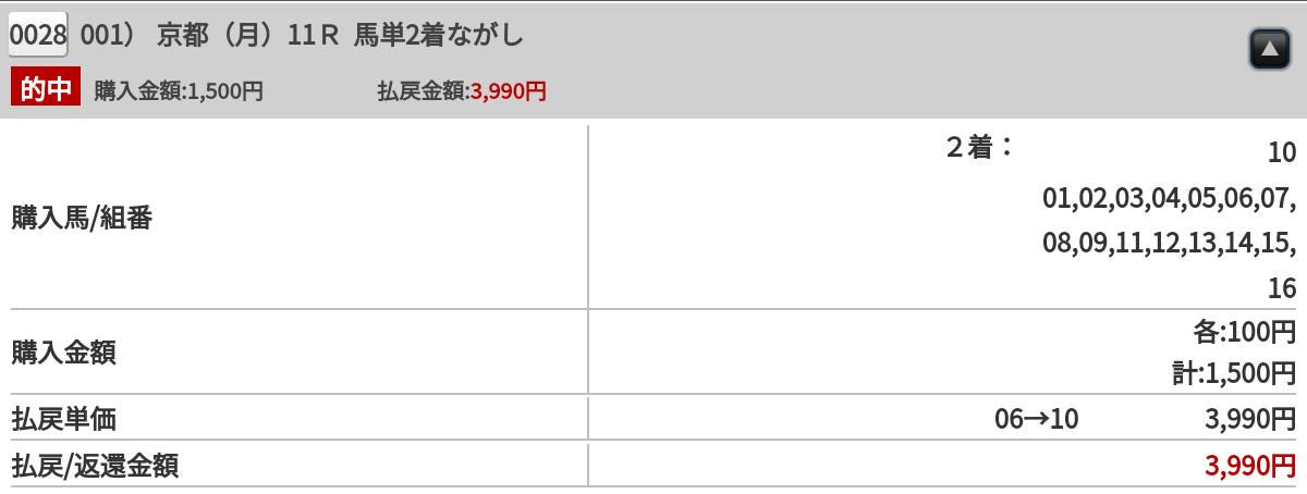 月曜京都11R1着③枠6番岩田望来④人気→5枠10番松山弘平②人気→8枠16番鮫島克駿①人気→6枠12番団野大成⑨人気