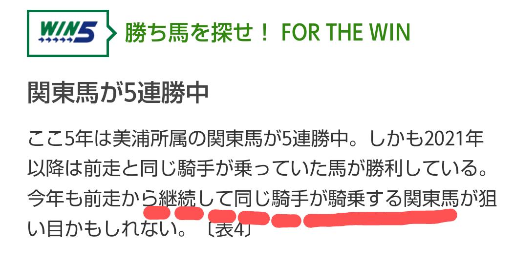 A.分析、WIN5の文章から優勝馬は関東所属、騎乗騎手継続を参考に。