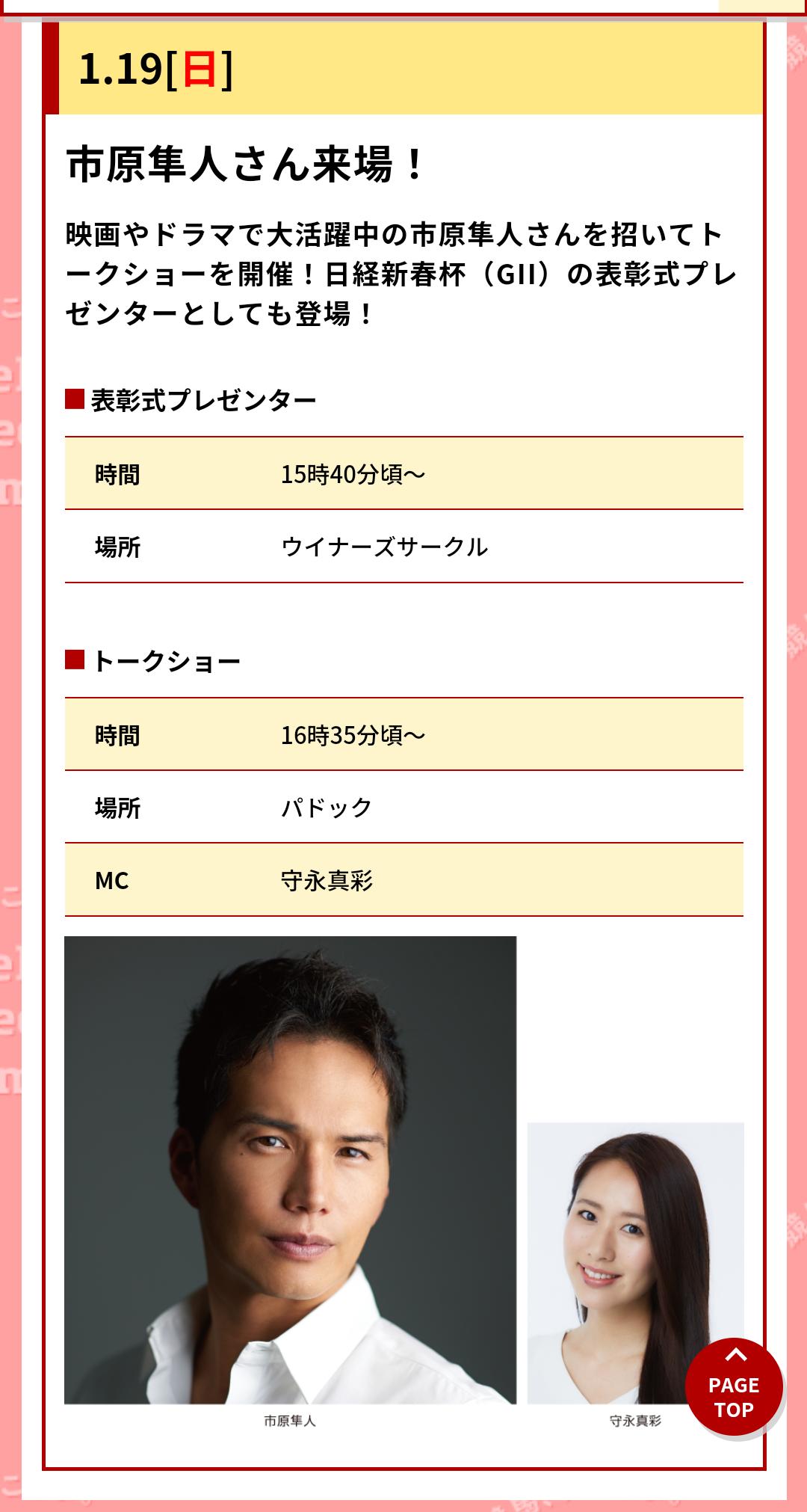 戦士の皆様こんばんわ、板場に失礼します…今週の日経新春杯&京成杯の考察で思い付いた点でカキコしました!日経新春杯のプレゼンターは市原隼人さんが来場予定→前回は58回テレビ西日本北九州記念にてプレゼンターとして来場しました…この時の決まり枠は7枠→5枠→1枠でした!市原隼人→市→1枠?今の所サインとして思います…そして京成杯はパッションリッチ·パーティカーン·ミニトランザットの3頭は→社台ファーム·キャッチコピー『…舞台…』関連性ありと思います!板場に失礼しました!今週は参加します、宜しくお願いします🙇
