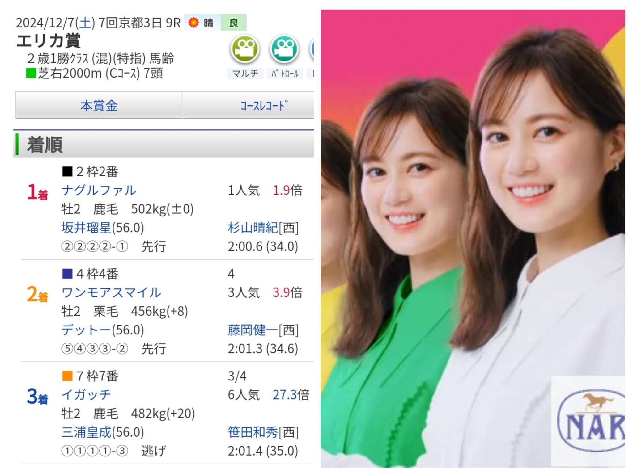 元乃木坂46の生田絵梨花さんのイメージキャラクター就任発表は12月6日で12月7日に京都9Rエリカ賞7頭立てがあり、