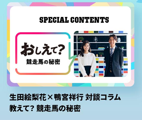 生田絵梨花さんと鴨宮祥行騎手の対談コラム『おしえて?競走馬の秘密』があります。