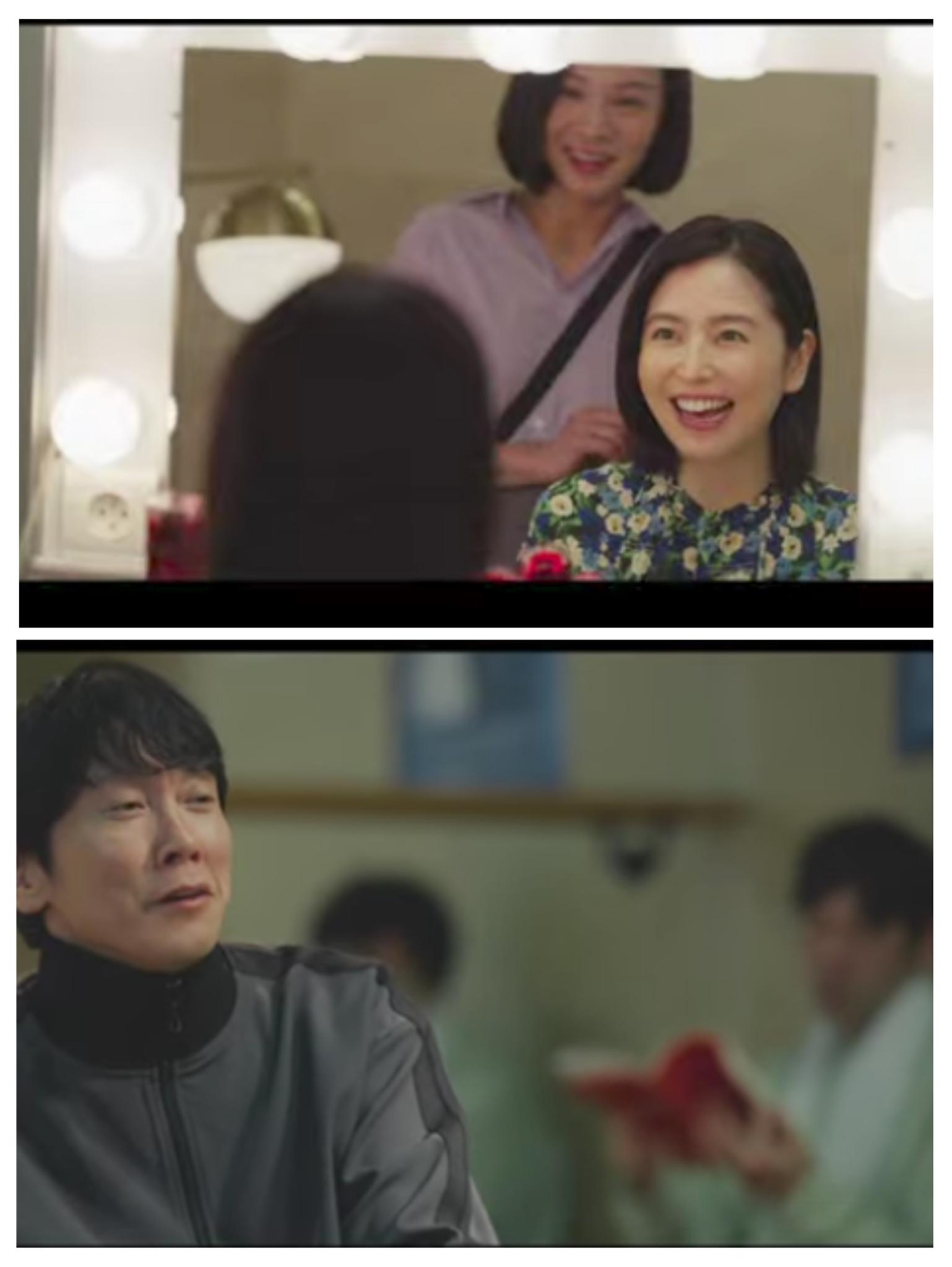 長澤まさみさんの後ろにいるのはメイクさんかな?佐々木蔵之介さんは芝居の稽古中の楽屋の一コマに感じます。後方で赤い本を読んでいる男がいますが、アレは台本か?