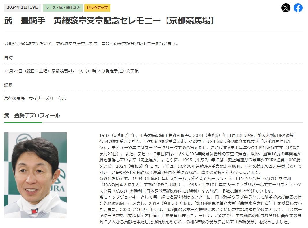 武豊 秋の叙勲のお祝いは今週か?