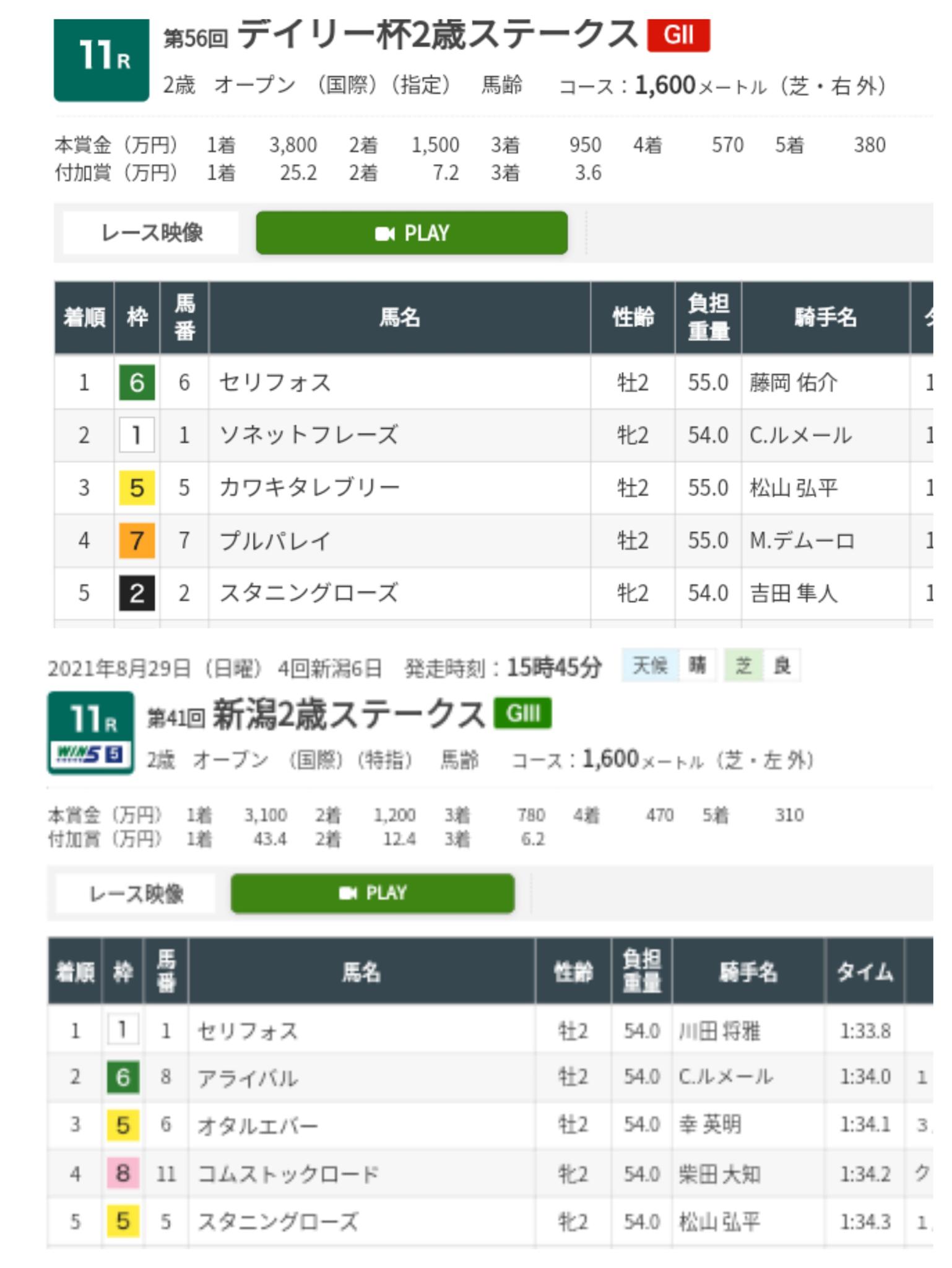 勝ち馬はどちらも「セリフォス」でスタニングローズはどちらも5着でした。