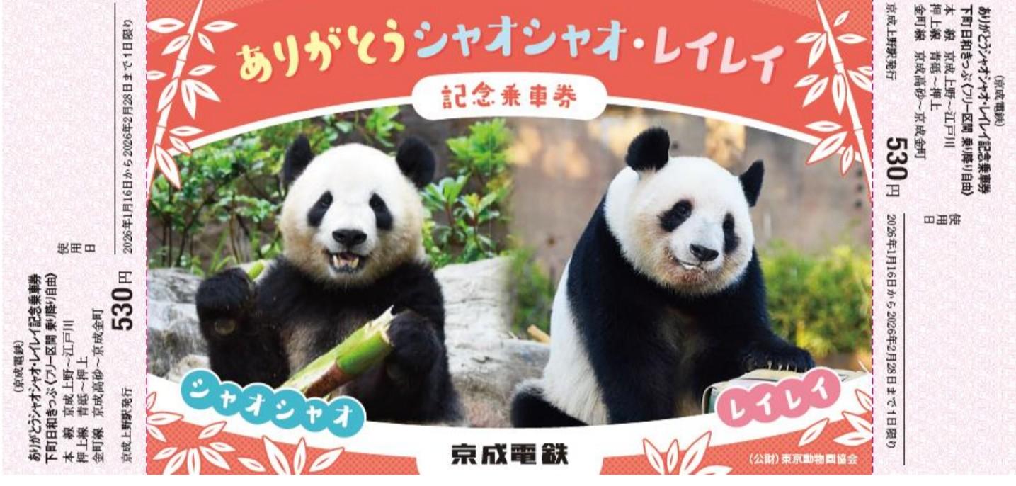 シャオシャオとレイレイのポストカード付き記念乗車券を、16日から京成上野駅などで販売。