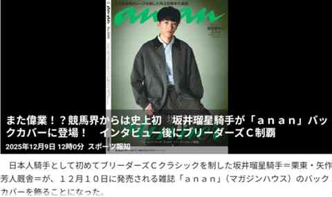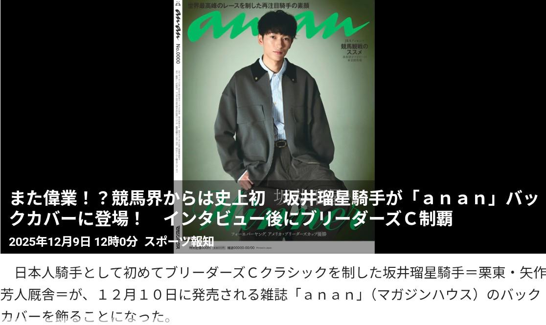 本日10日発売の「anan」のバックカバーを飾る坂井瑠星騎手。