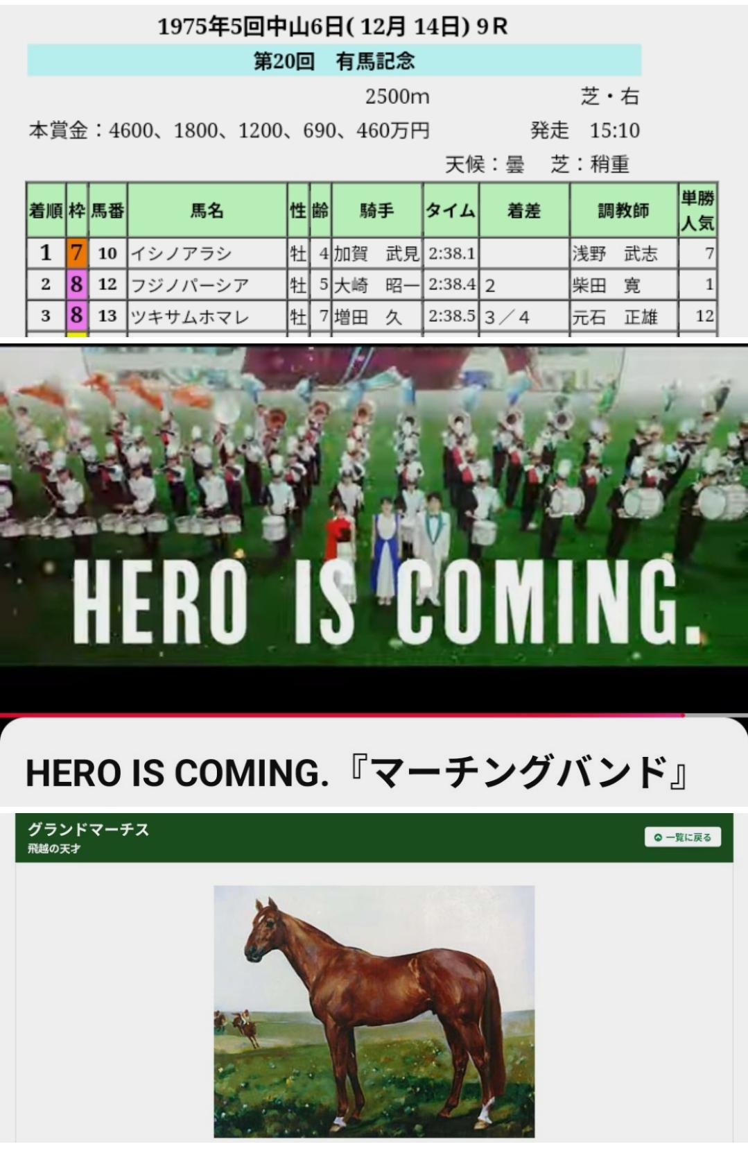CMのマーチ。そして【加賀武見】さんが話題だった阪神JF。その際に思い浮かんだのがグランドマーチスでありその年の1975年イシノアラシの有馬記念でした。