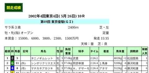 2002年日本ダービーは武豊騎手のタニノギムレット。
