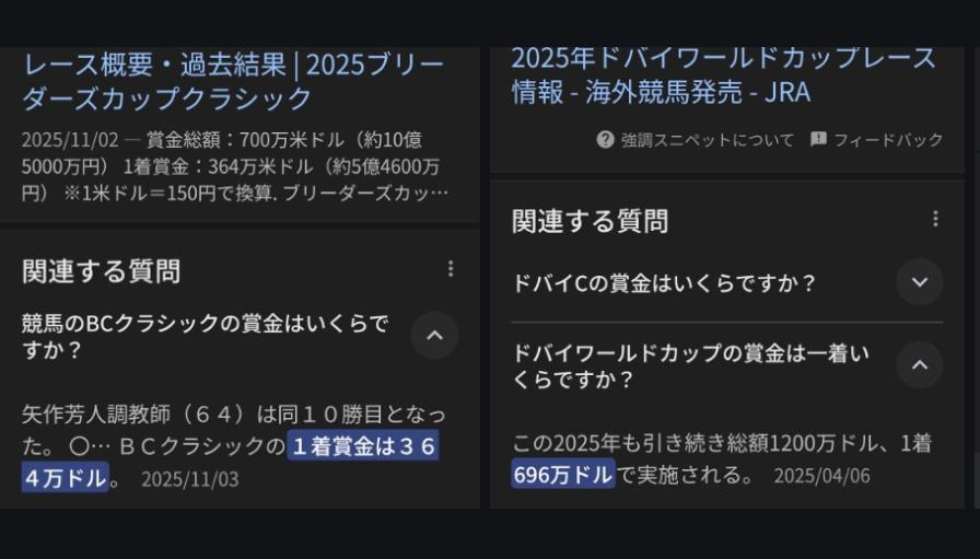フォーエバーヤングが勝ったアメリカの「ブリダーズカップクラシック」を調べると、ウィキでは「世界最高峰のレースの一つである」と書いてあります。 実際「ドバイワールドカップ」とどっちが上なんでしょうね。ちょっと気になりましたので。