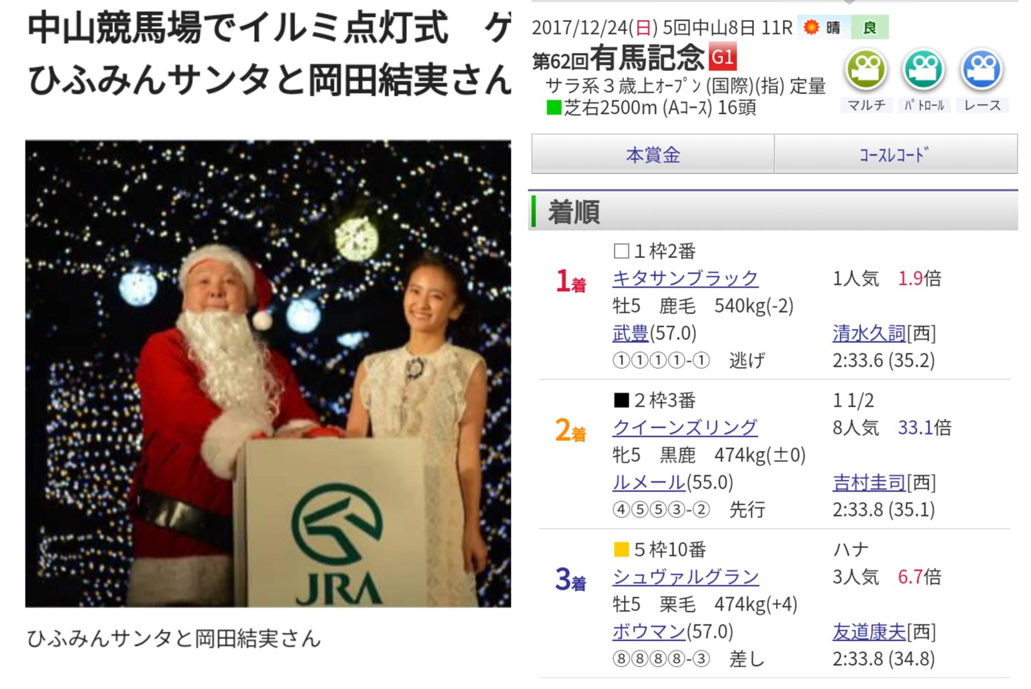 JRA絡みでは2017年の「中山競馬場クリスマスイルミネーション点灯式」に出ています。有馬記念で「キタサンブラック」が勝った年ですね。ひふみんの「サンタ」のコスプレ?先の『カムカムエヴリバディ』にも「サンタ」が出て来て、「岡田結実」さんに振られたと記憶してます。