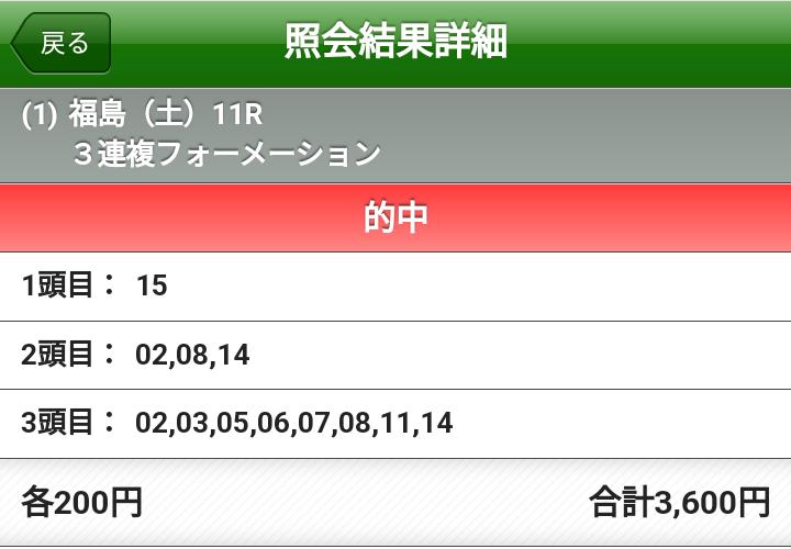 小倉4R3連複と福島11R複勝と3連複的中おめでとうございます。