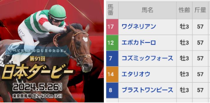 こんにちは、ダ−ビ−の枠順も出てイヨイヨ