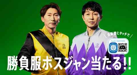 ※画像はボスのCMの最後に出てくる「ボスジャン」のプレゼントの画像ですが蛯名正義が着ているのが「マンハッタンカフェ」の勝負服風のジャンパー 横に武豊