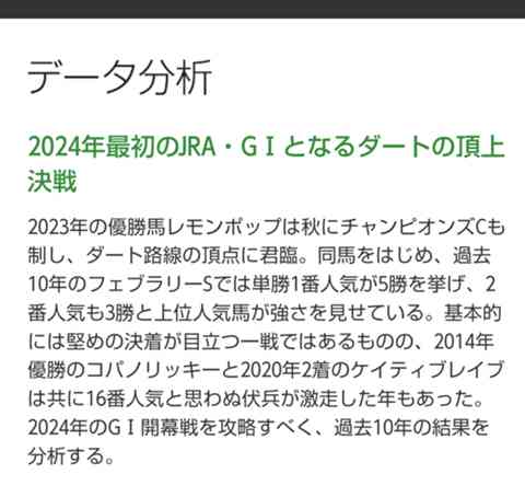 今年1年を占うレースですので意気込みと結果が噛み合えば言う事無しですが?キャッチコピー『2024年最初のJRA·G1となるダートの頂上決戦』…数字がありアルファベットがあり漢字がありサインとして感じる部分となると個人的な意見ですが『ん』が2個となると?やっぱし馬名かなぁとそうすると4頭の出馬候補が上がります…その中でもレッドルゼルが候補の1頭です!そしてもう1つのサイン的にあったのが『…JRA·』の部分アルファベットに区俗点?ひょっとして外国人騎手ならばキング、ルメール、デムーロ、ムルサバか?候補に挙げるなら、ムルサバ-ドゥラエレーデ牡5です。まだ始まったばかりですが今挙げたのが推測のなります。これから賑やかになると思いますが?候補の2頭に、長い論文すみませんでした!板主様すみませんでした!