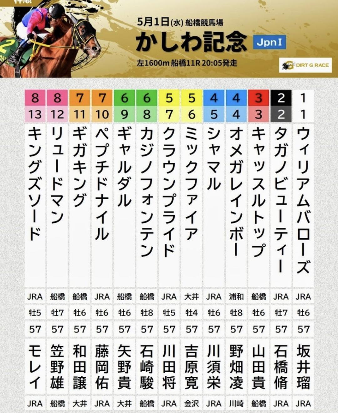 ピンクレディさん、返信ありがとうございます…天皇賞(春)の優勝馬⑭テーオロイヤルでした!今回の順番?は妄想です…⑮と見てます。結果は枠順まで分かりません?明日は船橋のかしわ記念に参加します…ありがとうございました!