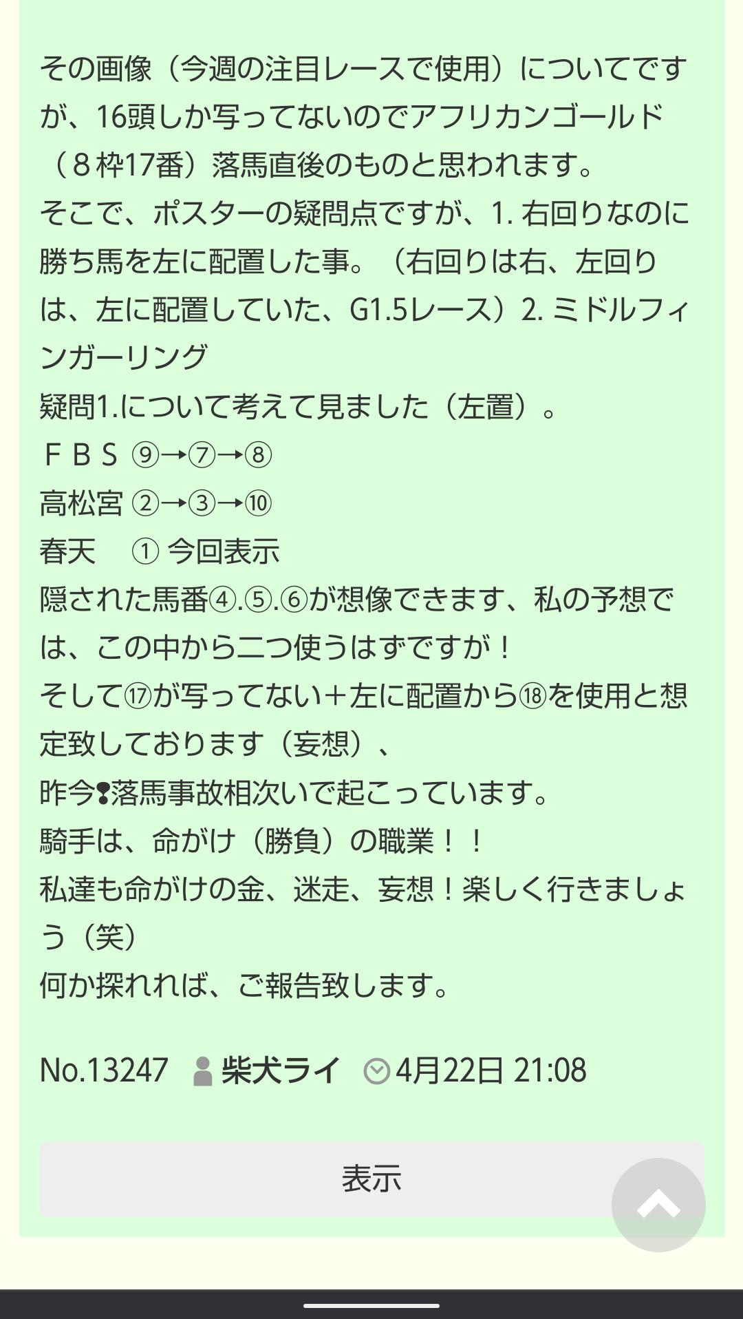 戦士の皆様お疲れ様です…昨日のレース的中去れた皆様おめでとうございます。…天皇賞では恥ずかしいレースは出来ないというのはある、ただ競走中止や骨折は公傷なので恥ずべき事でない。優勝馬テーオロイヤルが来年の春天に出たら注目したい…観戦しレース後のインタビュー等でアクシデントは避けられない、次回はヘッドライトを含む他の情報不足が今回のレースに対する意見になる?テーオロイヤル·アッパレでした!次回NHKマイルは頑張ります!