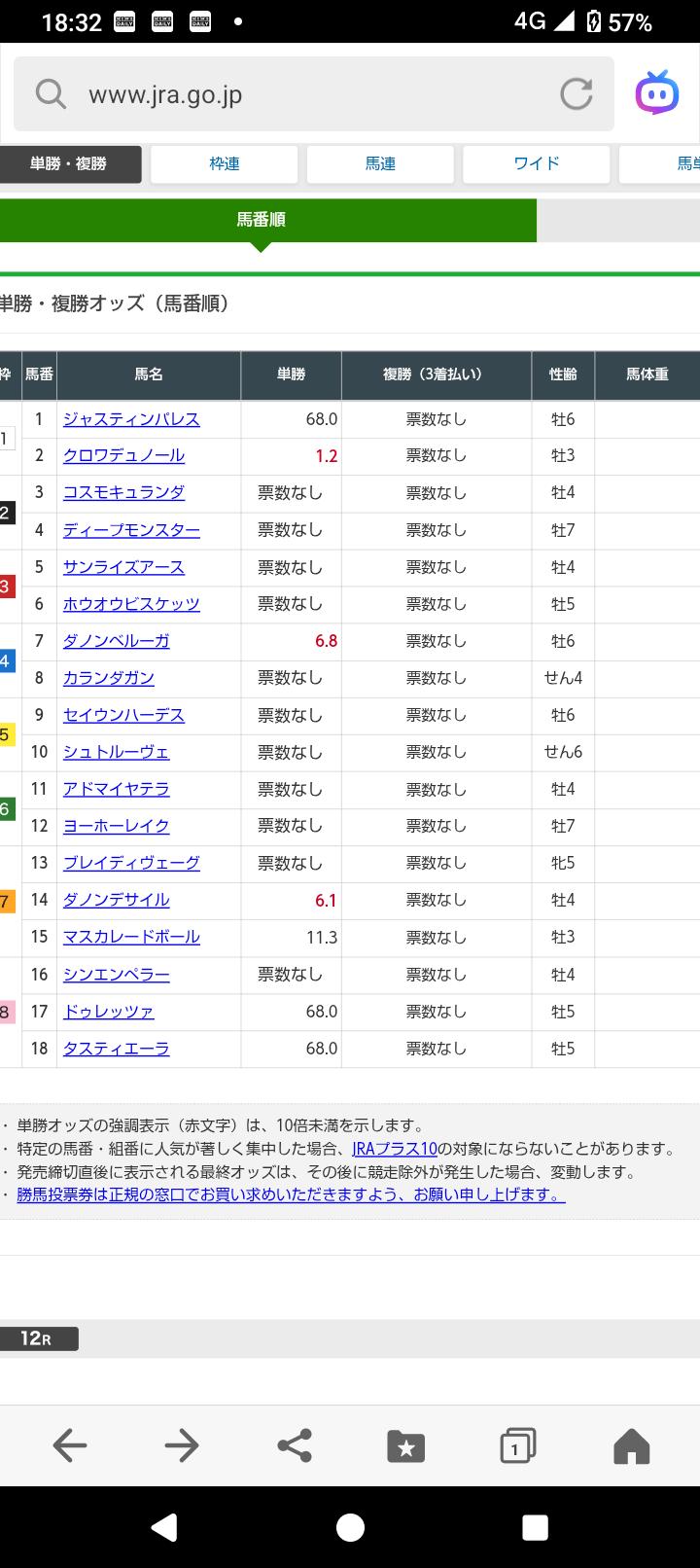 皆様の考察、大変参考にさせていただいております。馬柱から感じたことは、負担重量56kgに挟まれたべりべりホースとキャロット同居の8枠の坂井君が、海外G1でのよい知らせをもたらしてくれましたので、先ずは御褒美かなと?稚拙な読みで失礼いたします。