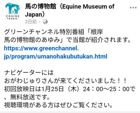 そして明日1/25日の深夜にグリーンチャンネルで「根岸 馬の博物館のあゆみ」という番組が放送されるそうです。