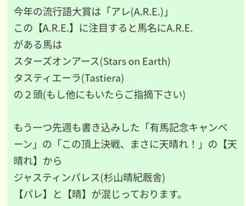 有馬記念の出馬表上も⑭プラダ(リア)と⑫(ウ)イン(マ)リリンですから、「有」と「馬」に挟まれた⑬タスティエーラは間違いなく支持されているものと思われ、この馬を軸馬にすることにします。