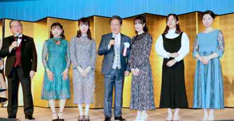 「中山馬主会会員忘年会」に集められた女性騎手が5名と「坂本冬美」で6名