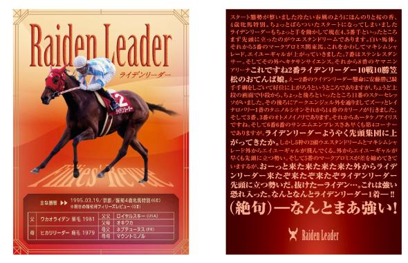 もう一回貼っときますけど右側の文字は「ライデンリーダー」が「4才牝馬特別(でしたっけ?)」を勝ったときの「杉本清」さんの実況コメントですね。