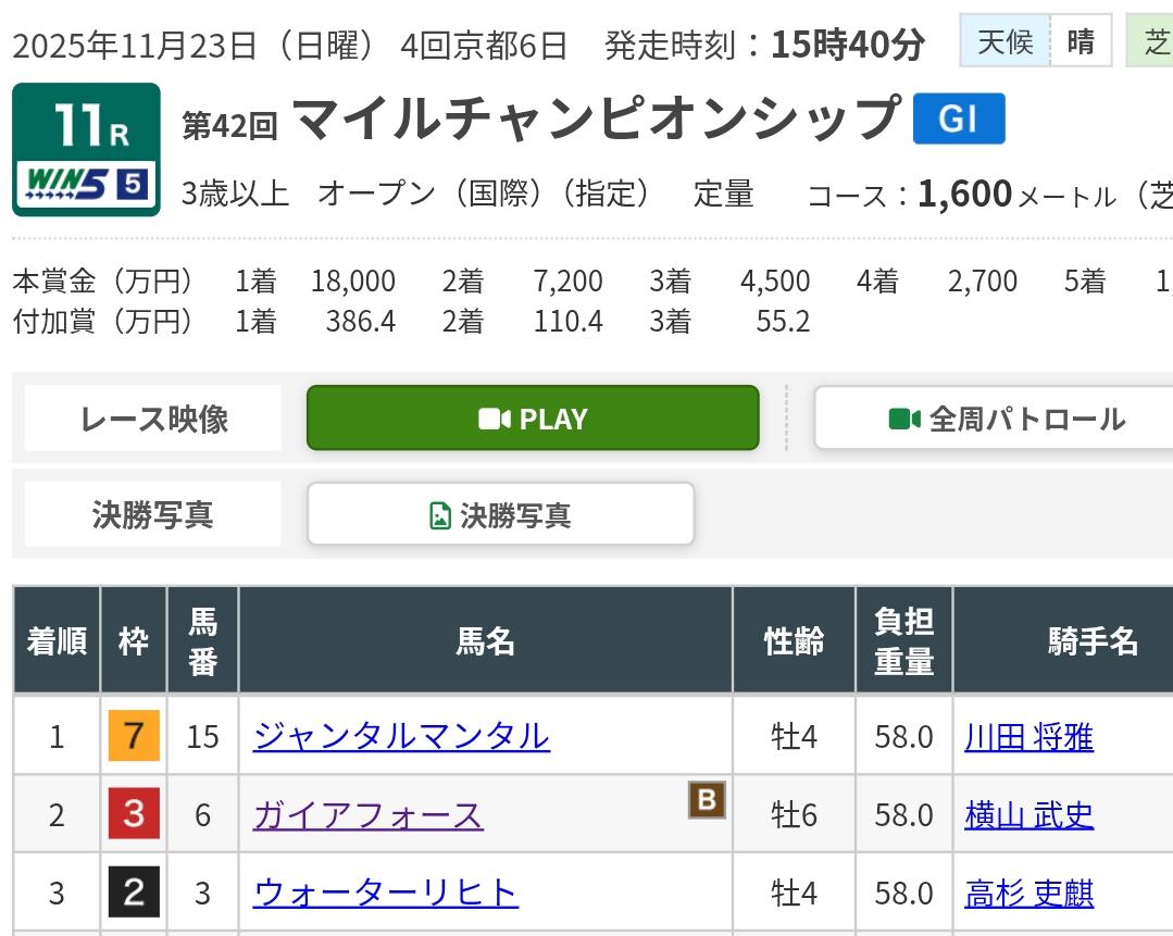 『昨日学んだ事』から、上記の内容を基に、ルメール騎手とマイルCSの結果へ追加購入。