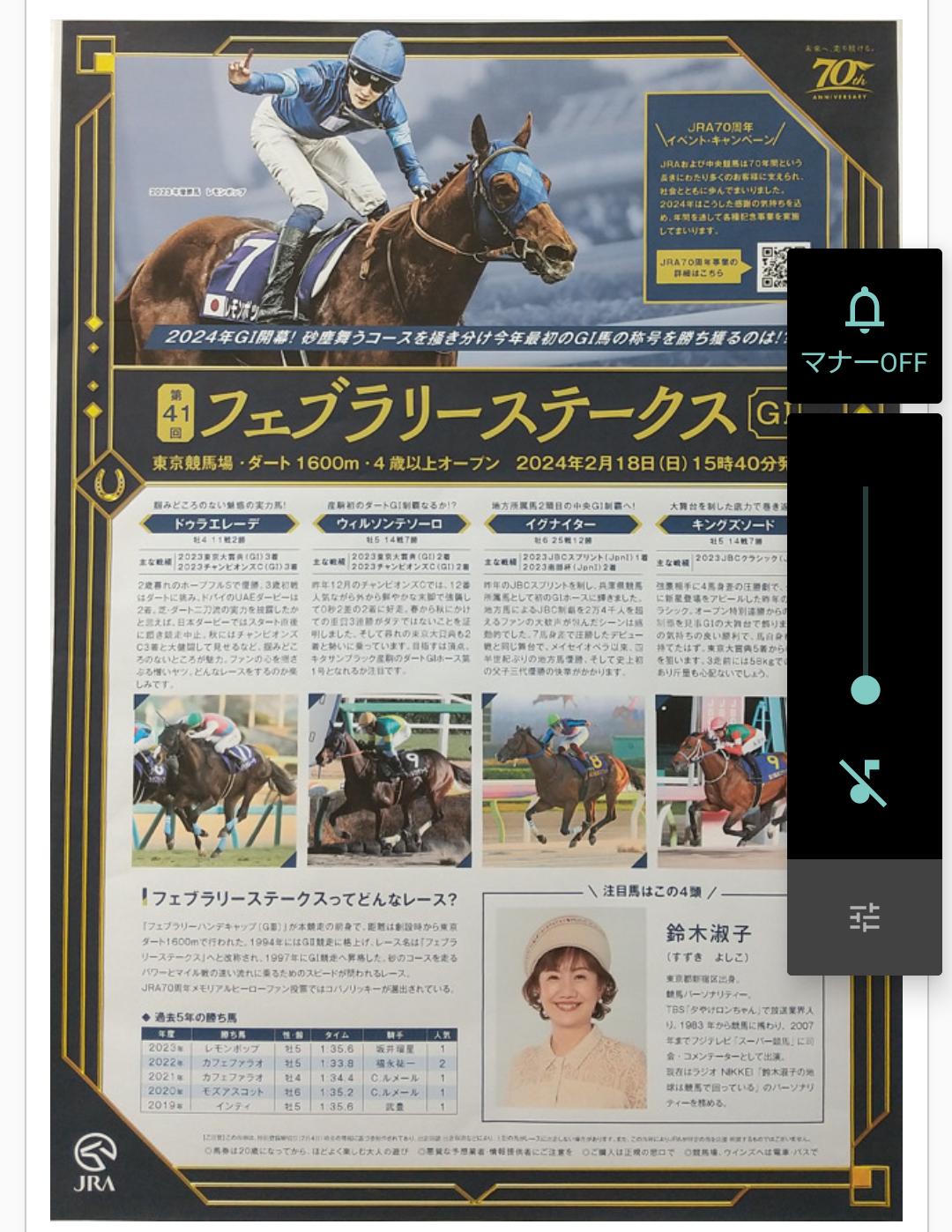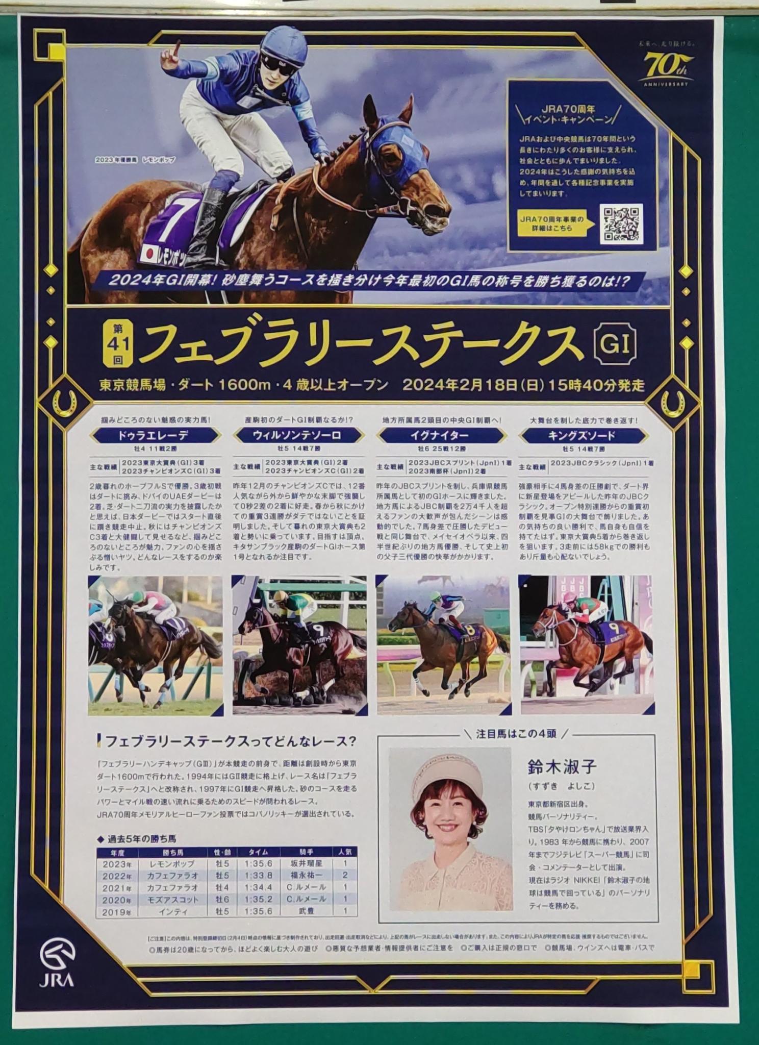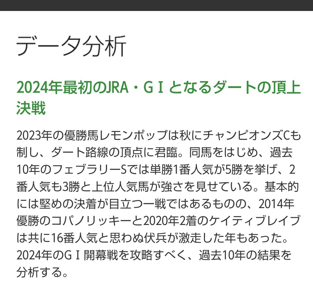 今年1年を占うレースですので意気込みと結果が噛み合えば言う事無しですが?キャッチコピー『2024年最初のJRA·G1となるダートの頂上決戦』…数字がありアルファベットがあり漢字がありサインとして感じる部分となると個人的な意見ですが『ん』が2個となると?やっぱし馬名かなぁとそうすると4頭の出馬候補が上がります…その中でもレッドルゼルが候補の1頭です!そしてもう1つのサイン的にあったのが『…JRA·』の部分アルファベットに区俗点?ひょっとして外国人騎手ならばキング、ルメール、デムーロ、ムルサバか?候補に挙げるなら、ムルサバ-ドゥラエレーデ牡5です。まだ始まったばかりですが今挙げたのが推測のなります。これから賑やかになると思いますが?候補の2頭に、長い論文すみませんでした!板主様すみませんでした!