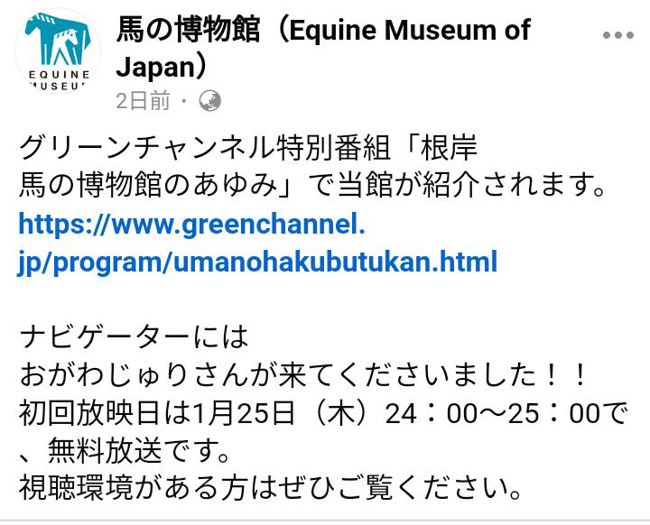 そして明日1/25日の深夜にグリーンチャンネルで「根岸 馬の博物館のあゆみ」という番組が放送されるそうです。