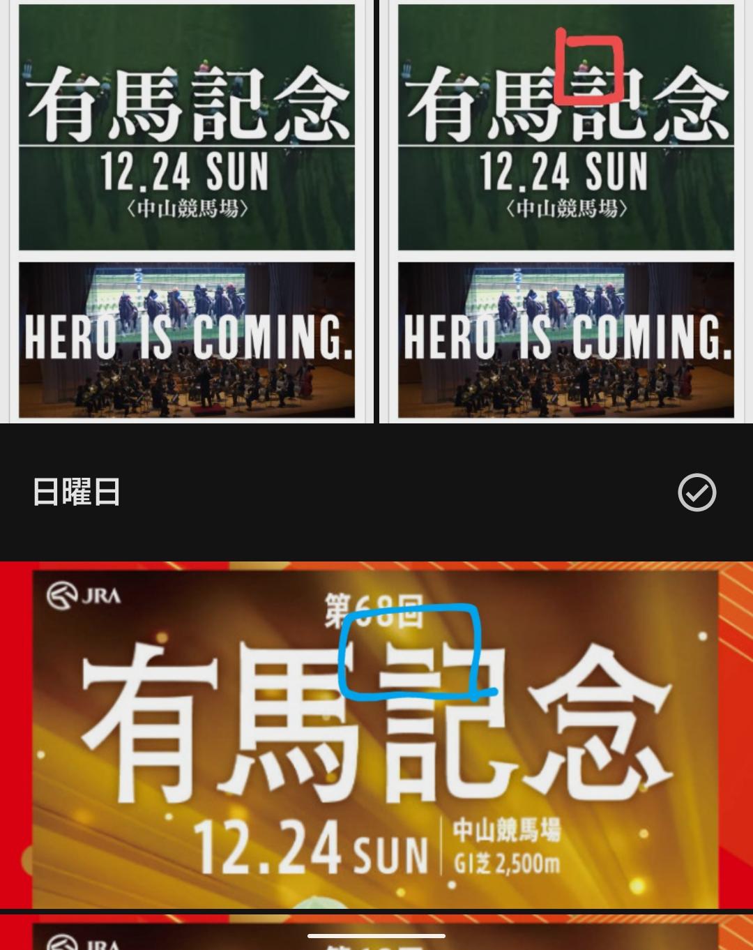 いつも皆様の示唆に富んだ投稿には競馬愛が溢れていますね。有馬記念の当日はクリスマスイブですね、そこで、まだ記憶に新しい先週の朝日杯フューチュリティSの4枠と5枠の7、8、9ゼッケンでクリスマスツリー🎄の文字が完成します。それともう一つ
