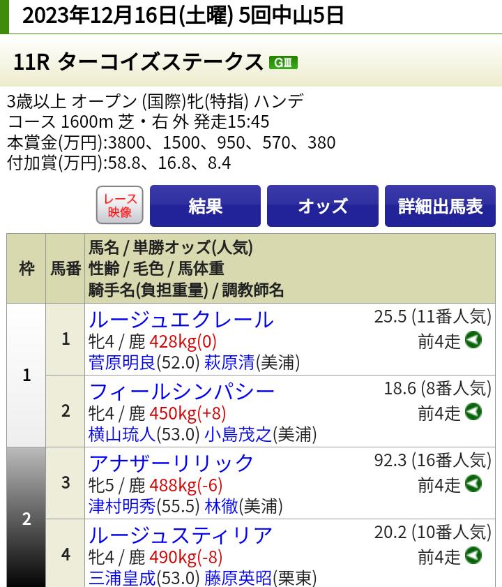昨年5月の目黒記念を1―②で1着したボッケリーニの隣りにいた1―①ゴールドギア(馬主、有馬博文さん)を有馬記念までチェックしていたのを思い出しました。