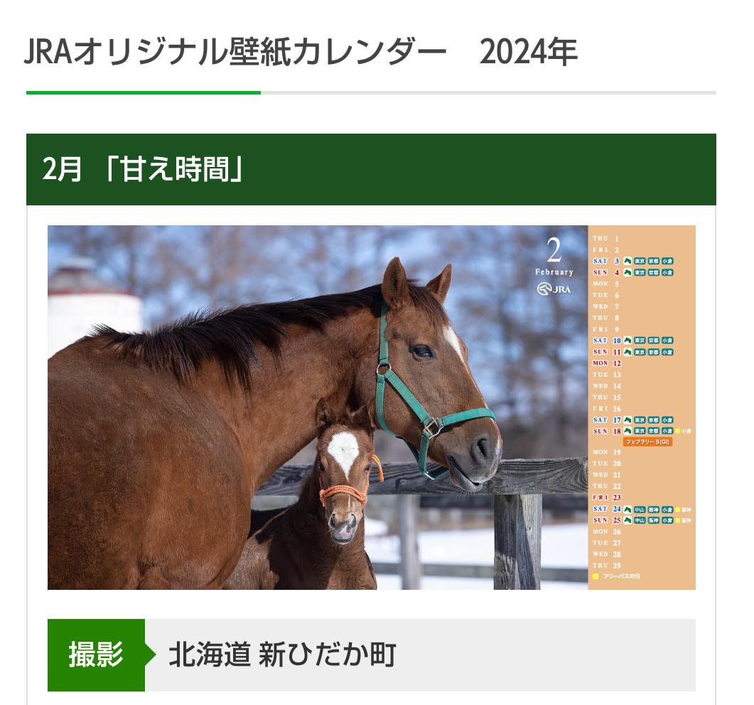 この時期のカレンダーは、牧場での母馬と仔馬の画像が多いですね。