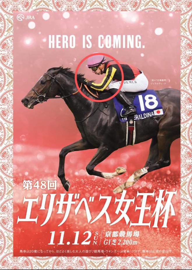 で、「イズジョーノキセキ」はポスターで気にしていた馬です。ポスターのデムーロ弟の左手が【J】に見える点です。