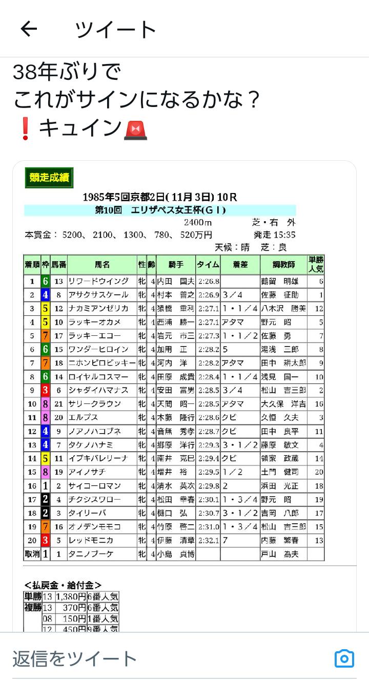 先に書き込みされていた、アルクリスプレーさんの38年前、第10回エリザベス女王杯の着順結果、21頭立て、取消(1―①)(枠連4―6)