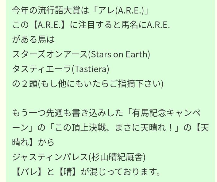 有馬記念の出馬表上も⑭プラダ(リア)と⑫(ウ)イン(マ)リリンですから、「有」と「馬」に挟まれた⑬タスティエーラは間違いなく支持されているものと思われ、この馬を軸馬にすることにします。