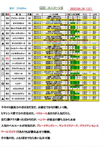 そのかわり、毎日暇なので、JRAの今週の特別レースが発表されると、写真のような表を作って、3歳馬はデビュー戦から、古馬は10戦前後のレースを見て検討して、ある程度の予測を立て、最後に皆さんの検討を最後に取り入れて決定しています。