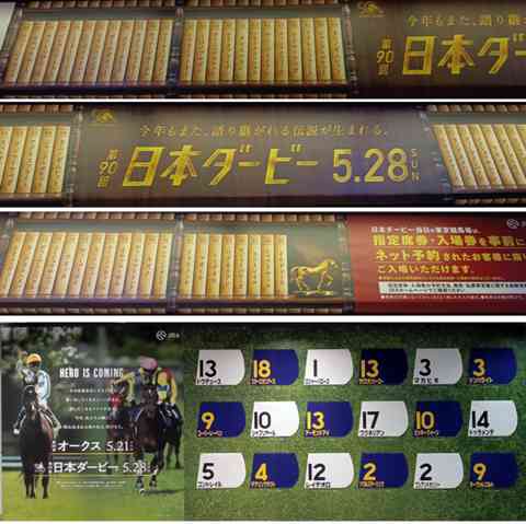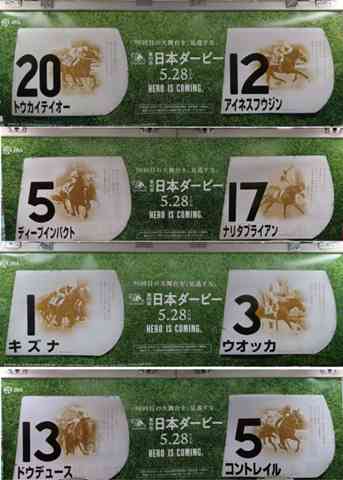 東京優駿で中吊りとホーム両方に名前があるのは13番ドゥデュースと5番コントレイルの2頭。